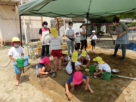 今週は、笹谷小の1年生が図工の時間に幼稚園の砂場に遊びに来ています。