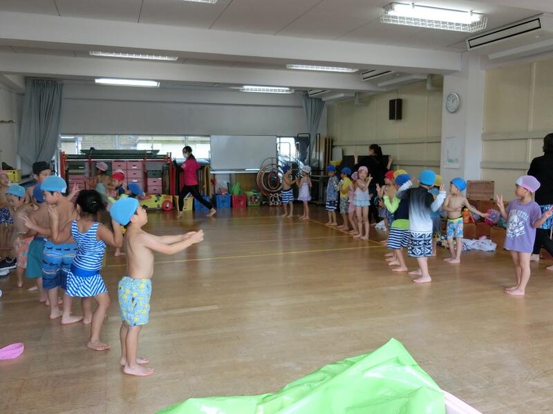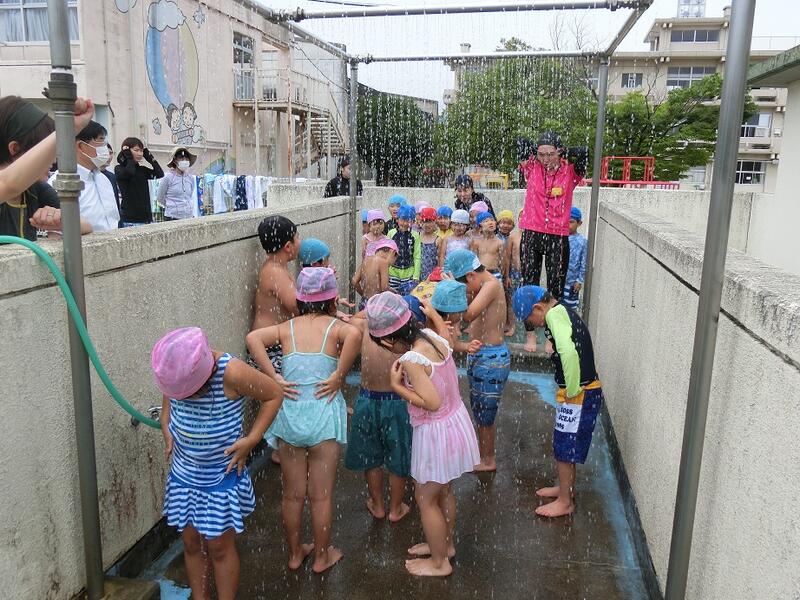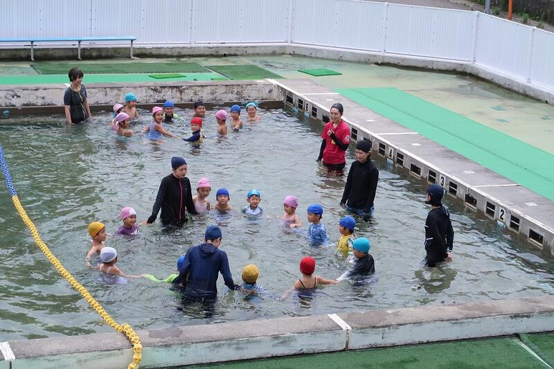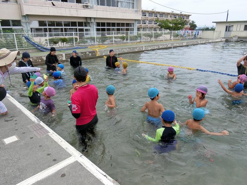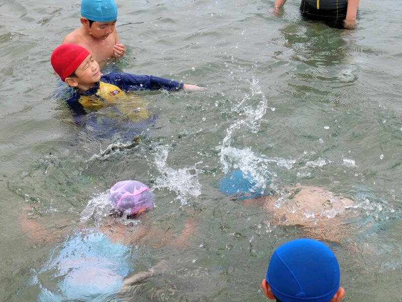 水の中を走ったり後ろ向きで歩いたり、クラスごとに大きな円に