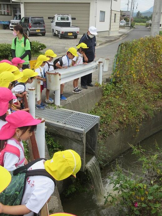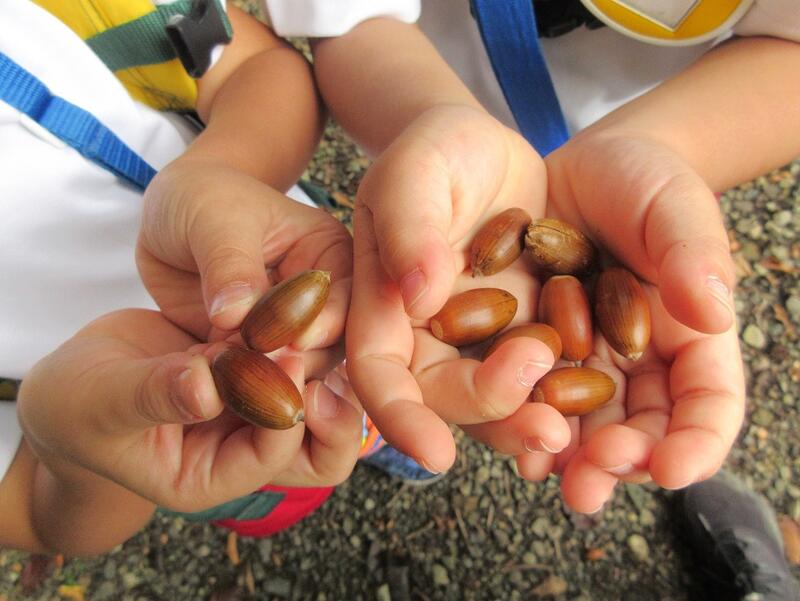 園長先生から田んぼにつながる水路について教えてもらったり、休憩場所でどんぐりを見つけたりしました。大きいどんぐり、細いどんぐり、子どもたちは大喜びで秋の自然にふれていました。