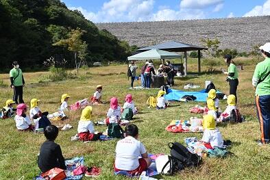 秋の遠足で、茂庭の摺上川ダムと広瀬公園に行きました。