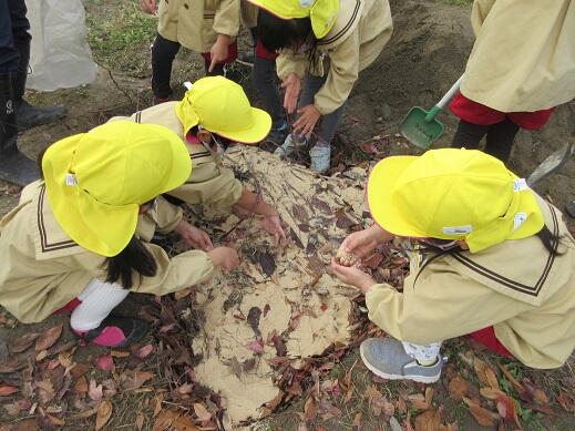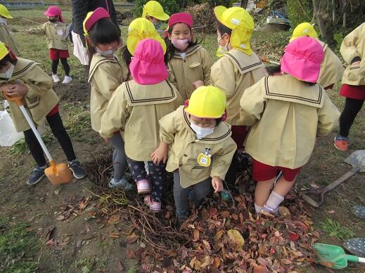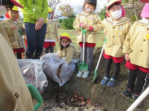 2021年11月30日 08時15分幼稚園のサクラの木の落ち葉を使って、来年の畑のために腐葉土を作りました。