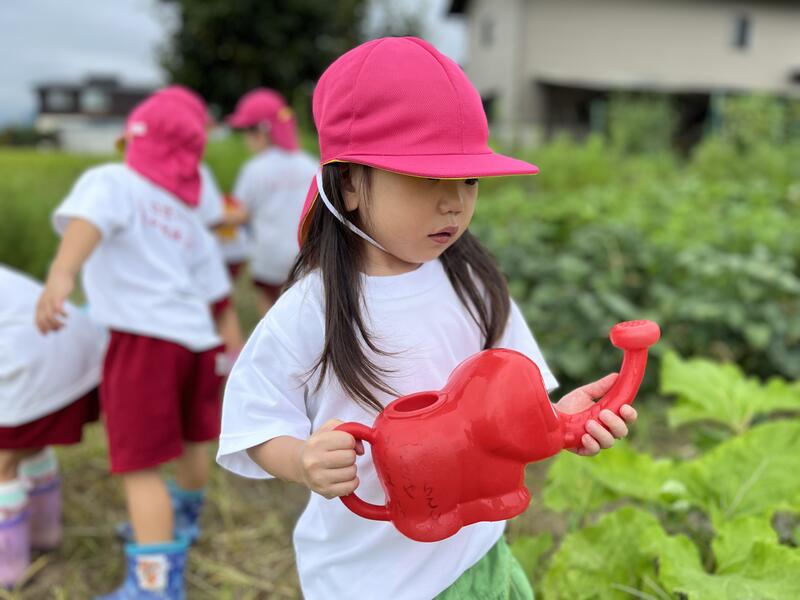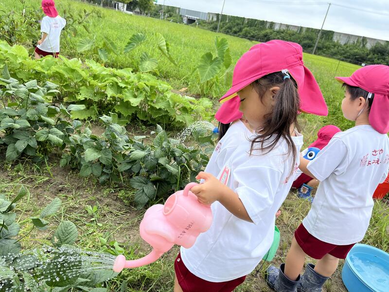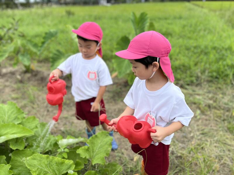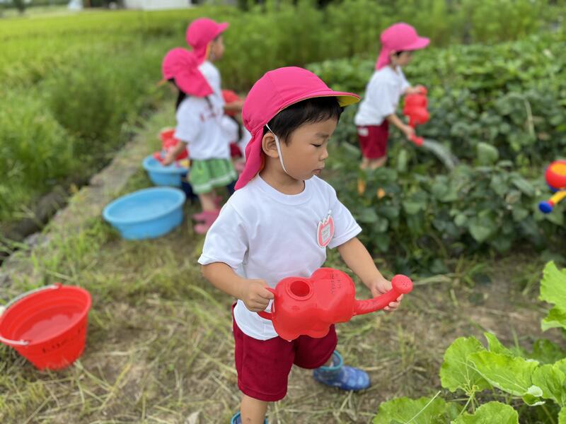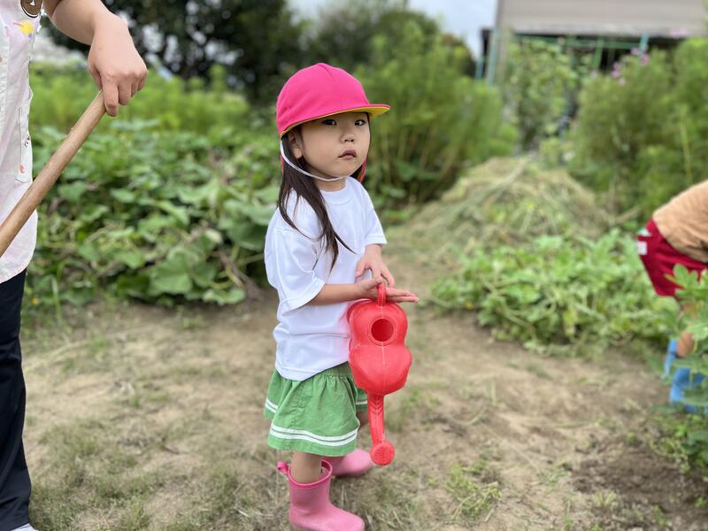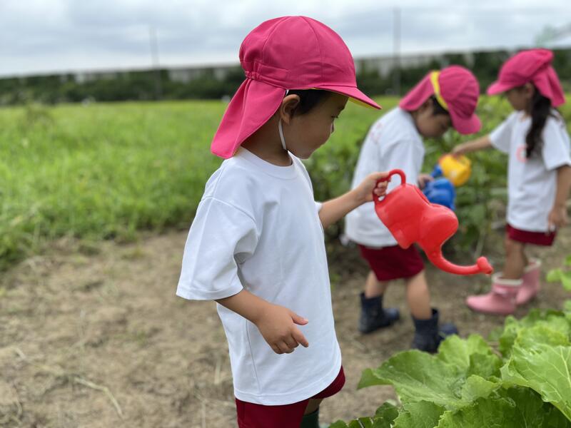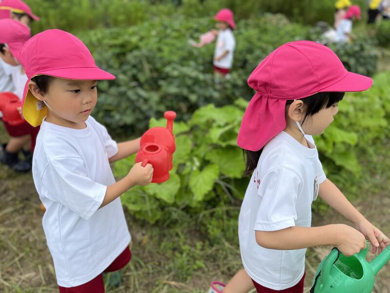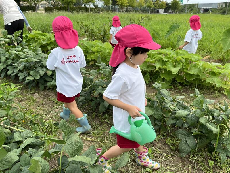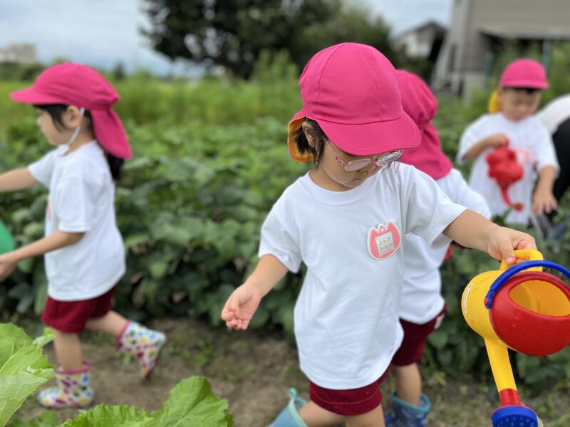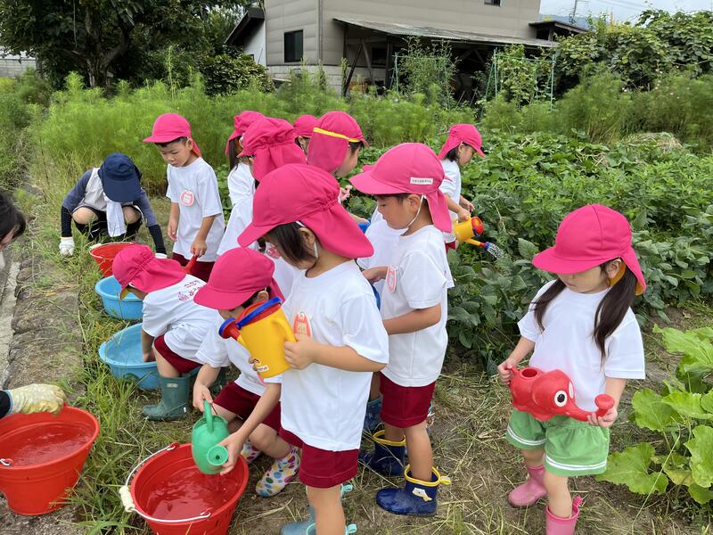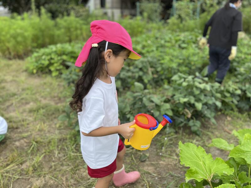 みんなで畑に行き、水をやったり、草をとったりしました。