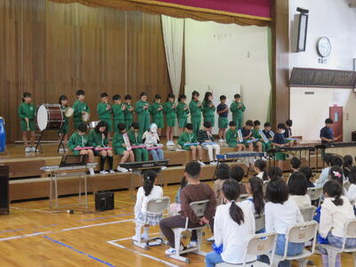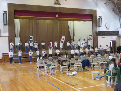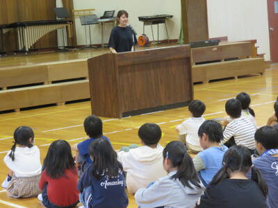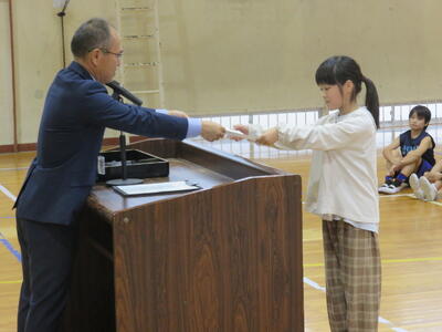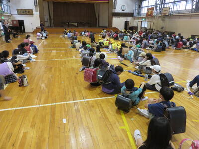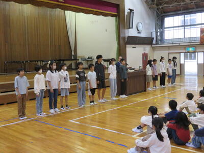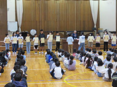 昼休みの後、体育館で全校集会を行いました。校長より「ゴミが落ちていたら拾って捨てる」など美化に関する話がありました。その後、福島市小学校陸上競技大会と福島地区青少年読書感想文コンクールの表彰が行われ、多くの皆さんが賞状を受け取りました。最後に、生徒指導の先生より今月のめあてについて話がありました。