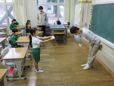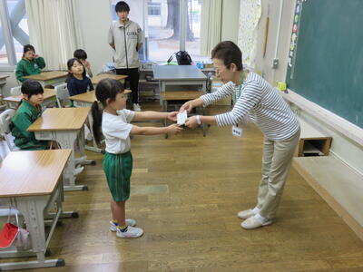本日、交通安全母の会会長より反射テープの贈呈がありました。代表で受け取った児童から「これからも安全に気をつけます。」と言葉がありました。毎年、2年生に送られ、暗い時期または時間帯に安全を確保するために使用してきました。校長からは「ランドセルにつけるといいですね。」と子どもたちに話がありました。