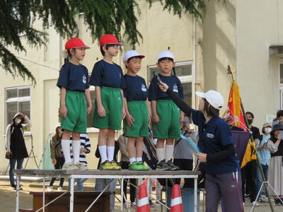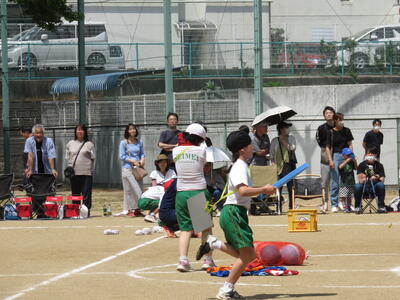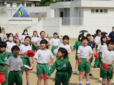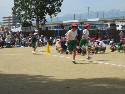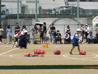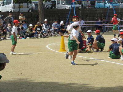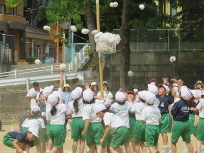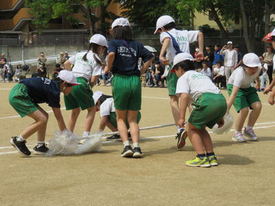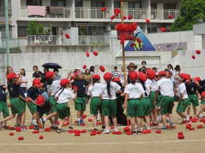 個人走に続いては、団体競技です。低学年は「チェッコリ玉入れ」、中学年は「清明タイフーン」、高学年は「バトンを落とすのをやめましょう」を行いました。
