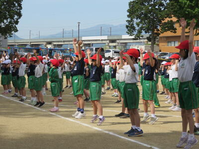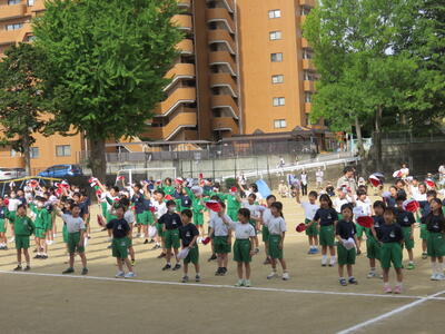 晴天のもと、清明フェスティバル(運動会)が開催されました。開会式の後、全校生でラジオ体操を行いました。