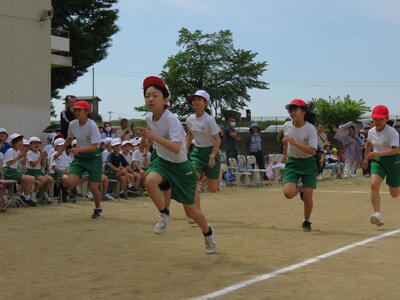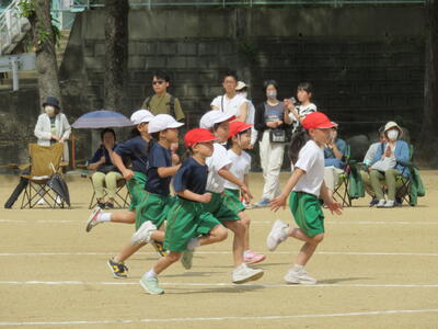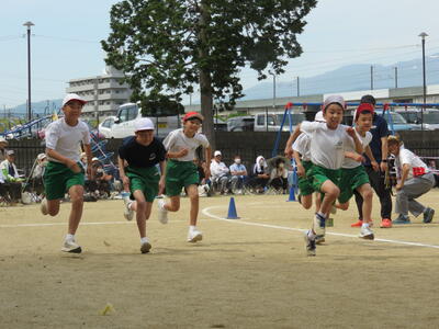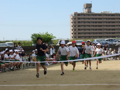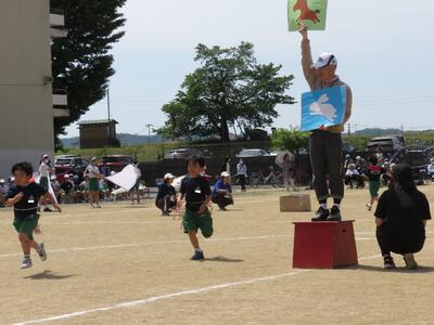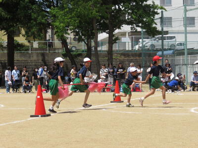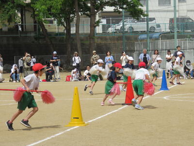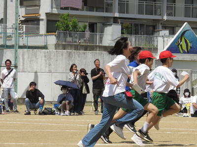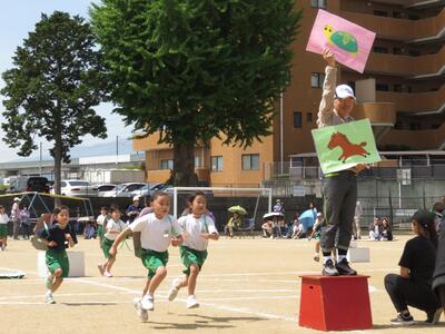 2024年5月11日 13時10分団体競技の後は、チャンス走です。低学年は「ラッキーアニマルズ」、中学年は「めざせ!金メダル」、高学年は「ちょっと拝借いたします」でした。
