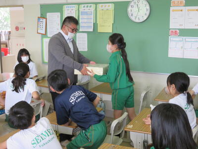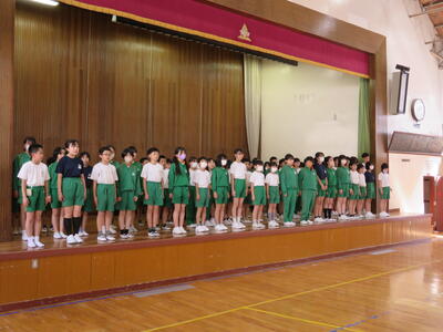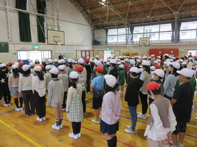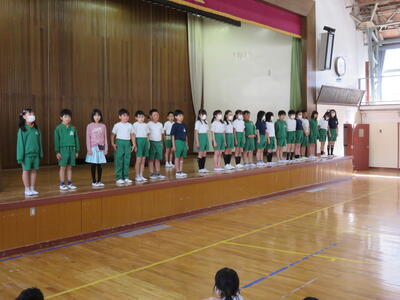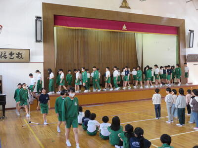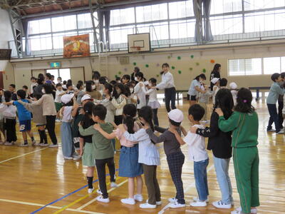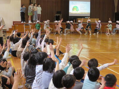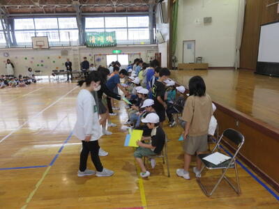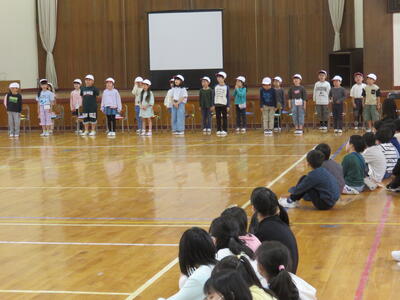 2024年5月1日 12時07分本日、4校時に全校生で1年生を迎える会を行いました。6年生と一緒に入場した後、クイズやゲームで楽しい時間を過ごしました。その後、プレゼントを一人一人に渡され、1年生全員でお礼の言葉を述べました。和やかな時間を過ごせました。6年生と実行委員が、準備や会の運営をしっかりと行いました。