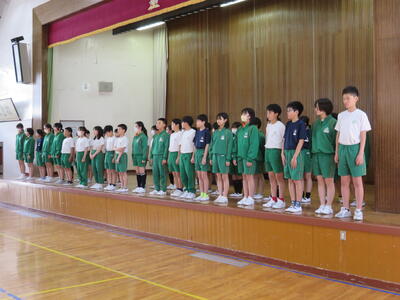 本日の全校集会は、5月15日に行われる福島市鼓笛パレードの壮行会を行いました。5・6年生がステージ上で担当パートを自己紹介しました。今からパレードが楽しみです。