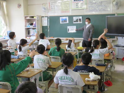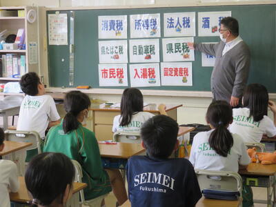 本日、4校時に外部講師に来ていただき租税教室を行いました。税金にはいろいろな種類があること、身の回りの必要なことに使われていることを学びました。市の公共施設建設には税金が使われていること、かかった金額などクイズに答えるなどしました。最後に1億円のレプリカを持ってみました。