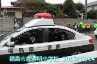 「年末年始の交通事故防止県民総ぐるみ運動」に伴い、6年生の代表児童がパトカーに乗り、交通事故防止へ向けた広報活動を行いました。