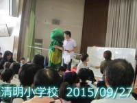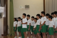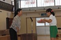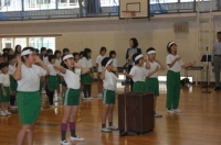 9月30日(水)の全校集会は10月1日(木)に行われる市小学校体育大会陸上競技大会の壮行会でした。出場する代表選手の紹介のあと、3・4年生のリーダーのかけ声に合わせて全校生でエールを送りました。選手代表あいさつでは「練習の成果を発揮し、入賞めざしがんばります」と抱負を述べてくれました。