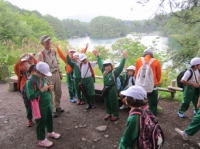 前日までの雨もあがっていましたが、あいにくのくもり空で、磐梯山は望むことはできませんでしたが、森の案内人の方々のガイドのもと、裏磐梯の自然について学びながら楽しく散策することができました。森の案内人の方からは、全校生一人1人に、手作りの散策記念品もいただきました。