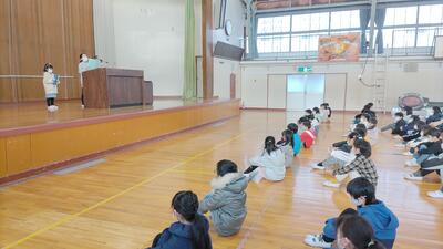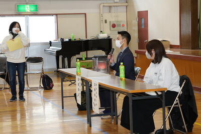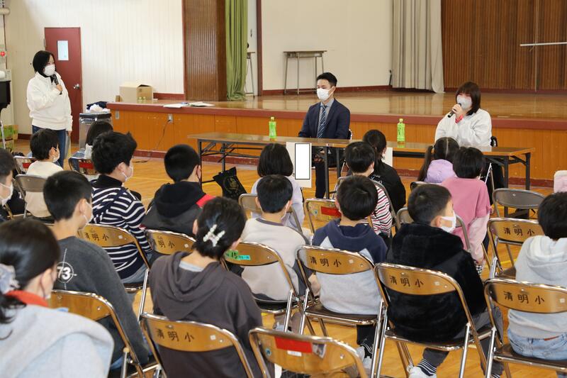 清明小学校の卒業生2名に来校いただき、小学校時代の思い出や将来役に立つこと、今やった方がよいことなどのお話をいただきました。