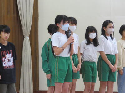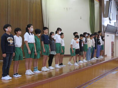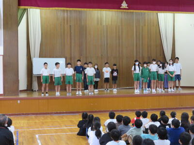 本日の全校集会では、理科作品展の表彰の後、10月2日に実施予定の福島市小学校陸上競技大会の壮行会を行いました。個人種目、リレーに出場する選手が自己紹介した後、校長より全力を出し頑張ってくださいとの話がありました。その後、5年生を中心にエールを送り、最後に選手代表から全校生に挨拶がありました。