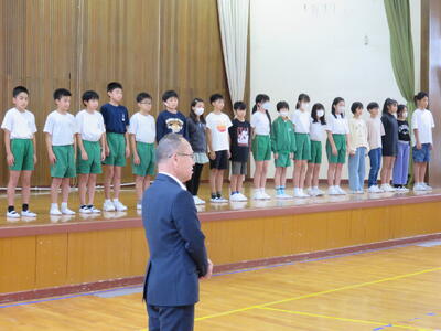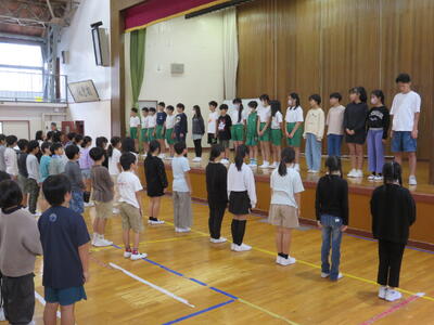 2024年9月25日 14時27分本日の全校集会では、理科作品展の表彰の後、10月2日に実施予定の福島市小学校陸上競技大会の壮行会を行いました。個人種目、リレーに出場する選手が自己紹介した後、校長より全力を出し頑張ってくださいとの話がありました。その後、5年生を中心にエールを送り、最後に選手代表から全校生に挨拶がありました。