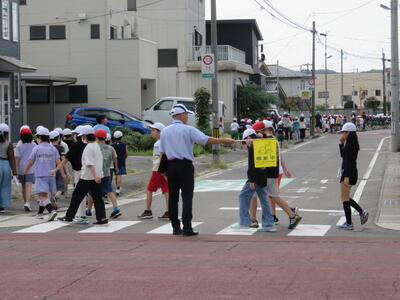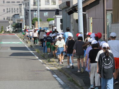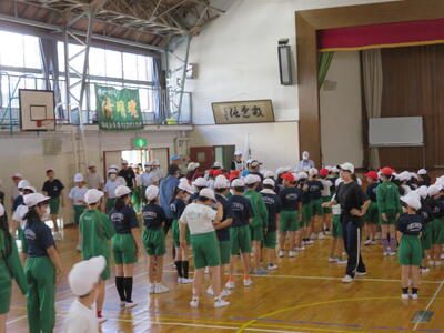 2024年9月30日 11時10分本日の3校時目に、荒川が氾濫した場合の避難訓練を行いました。まず、放送の指示に従って体育館に一次避難した後、福島第一小学校への二次避難に移りました。途中まで避難し戻りましたが、安全に気を付けて真剣な態度で訓練に臨んでいました。最後に、体育館で校長と係から8.5水害やなどの話がありました。
