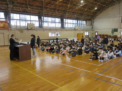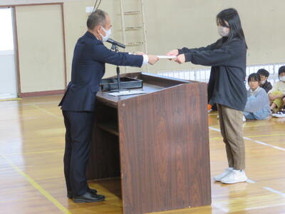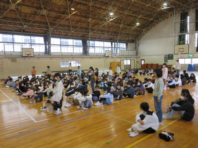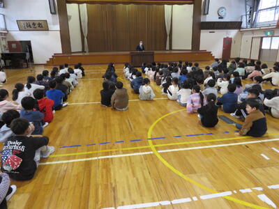 11月の全校集会を体育館で行いました。まず校長先生から「風邪が流行っているので、体調に気を付けること」「寒くても手をポケットに入れずに歩くこと」そして「6年生のフィールドワークでは、下調べをしっかり行ったことにより充実した活動ができたこと」などの話がありました。その後、各種表彰が行われました。