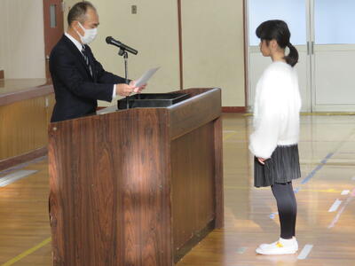 2024年11月27日 14時44分11月の全校集会を体育館で行いました。まず校長先生から「風邪が流行っているので、体調に気を付けること」「寒くても手をポケットに入れずに歩くこと」そして「6年生のフィールドワークでは、下調べをしっかり行ったことにより充実した活動ができたこと」などの話がありました。その後、各種表彰が行われました。