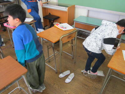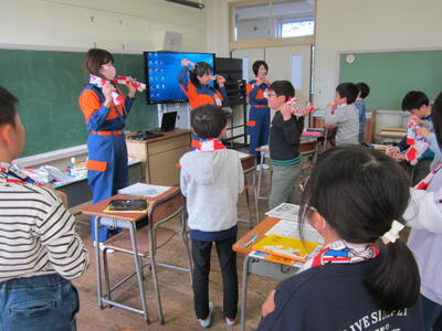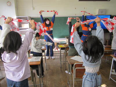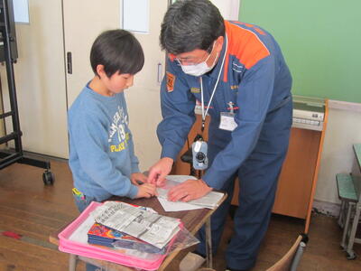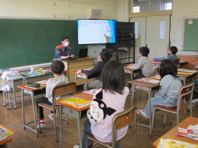 2024年11月28日 15時38分福島消防署のみなさんと、福島市消防団女性消防隊のみなさんにお世話になり、防火防災出前教室を行いました。火事から身を守る行動の大切さについて学びました。防災バックの中身を実際に見せていただき、子どもたちは興味津々でした。災害時における手ぬぐいの使い方を実践したり、新聞紙で防災スリッパを作ったり、たくさん学んだ1時間でした。