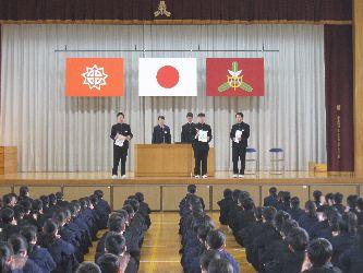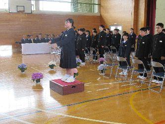 修了証書は1学年を代表して赤井晃佑さんが、2学年を代表して阿部英弦さんが授与されました。また、生徒代表意見発表は1年生を代表して安田空未さんが、2年生を代表して阿部蓮さんが立派に発表しました。