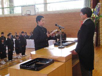 校長式辞、来賓祝辞に続き、新入生代表の浅間美優さんに教科書が給与され、その後、佐藤彪凱さんが新入生誓いのことばを立派に述べました。