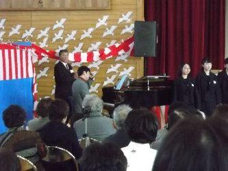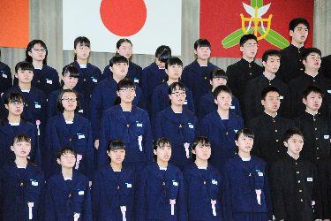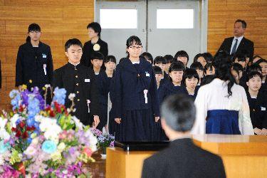 式歌として、在校生は「流れゆく雲を見つめて」を、卒業生は「旅立ちの日に」を、そして全校合唱では「大地讃頌」を美しいハーモニーで歌いました。歌う中で様々な想いがこみ上げてきたためか、目に涙を浮かべる卒業生もたくさんいました。