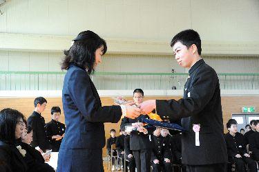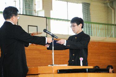 PTAからの卒業記念品である証書ホルダーは,PTA副会長の菊田恵子様より卒業生を代表して神長倉巧さんが授与しました。また,卒業生からの卒業記念品としてデジタルタイマーの目録を,卒業生を代表して手塚愛莉さんが校長に贈呈しました。
