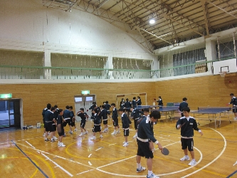 画像は、先輩の指導のもと、新入部員が熱心に素振りをしている卓球部と、部活動終了後の後片づけをしているバレー部の様子です。