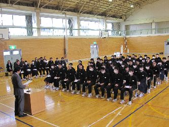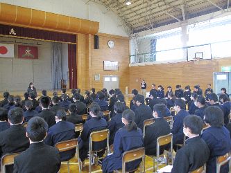 3年生は19日(木)から2泊3日の修学旅行です。本日4校時にその結団式を行いました。修学旅行は,久遠祭(文化祭)や中体連・合唱祭と並び,中学校生活において一生の思い出になる行事です。この行事を成功させるため,現在まで実行委員をはじめ,3年生全員が事前調査をしっかり行い,フィールドワーク等の計画を立ててきました。
