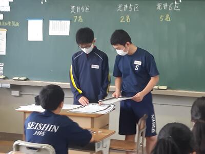 方部生徒会 2022年7月12日 14時50分 続きを読む 昨日7月11日(月)の放課後、第1回方部生徒会を各教室で行いました。21の方部ごとに行いましたが、人数のもっと多い方部が26名、少ない方部は1名です。少ない方部はまとまって実施しました。議題は、顔合わせ、組織づくり、計画づくり、そして10月29日に実施するエコティアデイ当日訪問する家の場所確認を行いました。ほとんど方部は3年生が話を進め、初めての1年生に丁寧に説明していました。保護者の皆さんエコティアデイへのご協力、よろしくお願いします。 閉じる