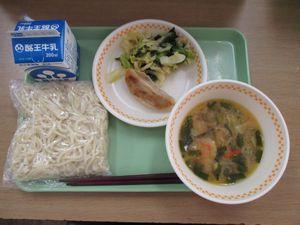 今日の給食のメニューは「中華麺・牛乳・わかめサラダ・餃子・みそラーメン汁」でした。今日の献立を考えてくれたのは,6年3組の2班さんです。「味噌ラーメンとサラダの相性がすばらしい」とどのクラスでも好評でした。野菜をたっぷり摂ることができて身体にも良い献立でした。