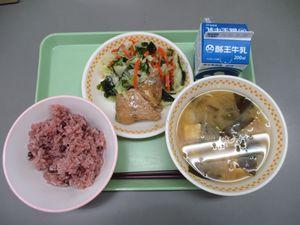 1月22日(金)は【栄養たっぷり和風献立】です。メニューは「赤飯・牛乳・和風サラダ・鯖の味噌煮・わかめの味噌汁」でした。今日の献立を考えてくれたのは,6年3組の5班さんでした。成長期に欠かせない体を作るもとになる栄養素をたっぷり入れた献立でした。鯖は筋肉や血液を作るもとになります。わかめは丈夫な骨や虫歯になりにくい歯を作るもとになります。皆さんも栄養のバランスを考えて食事のメニューを考えてみましょう。