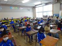 (真剣に放送を聞く1年生の各学級の子ども達)