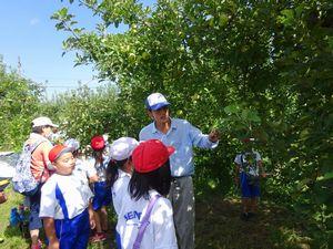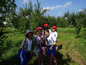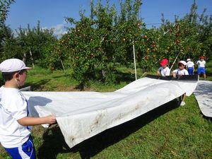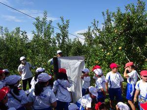 先日,3年生は総合的な学習で「果樹園やまと」に見学に行きました。今回は、りんごの木の下に反射シートを敷くのを手伝ったり見学したりしました。前回見学した時より、りんごの実が大きくなり色づいてきたのを見て、大喜びでした。