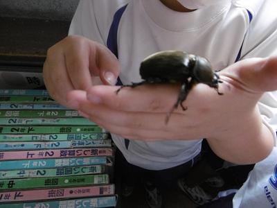 森の案内人の蓮沼さんから頂いたカブトムシの幼虫がたくさん孵化しました。子どもたちは,休み時間になると我先にカブトムシに触って楽しんでいます。
