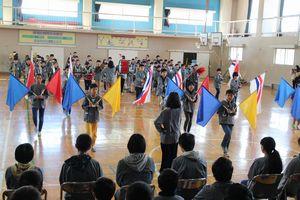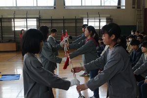 本日3校時体育館で5年生と6年生が鼓笛隊の委杖式を行いました。明日から臨時休校になるため、本年度最後の登校日に実施できて6年生にとっても5年生にとっても感慨深い式になったようでした。6年生の指揮者から5年生の指揮者に指揮杖が委杖されたあと、5年生が練習してきた”校歌””ドラムマーチ””RPG”を演奏しました。5年生の演奏を聴いている6年生の表情には、しっかりと引き継げたことへの笑顔が見られました。5年生も6年生が卒業した後、学校の中心となって頑張っていくことへの思いを新たにもつことができたことでしょう。