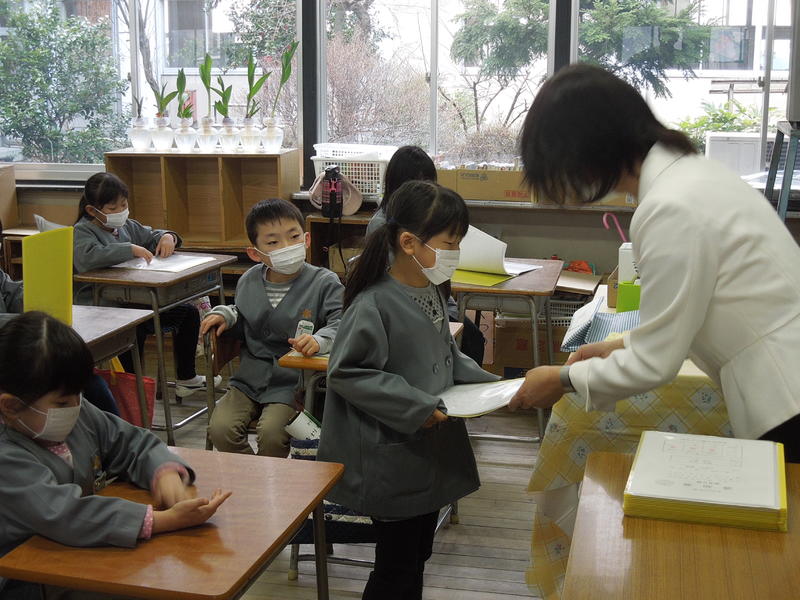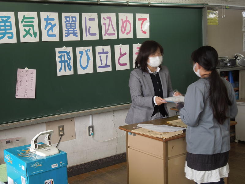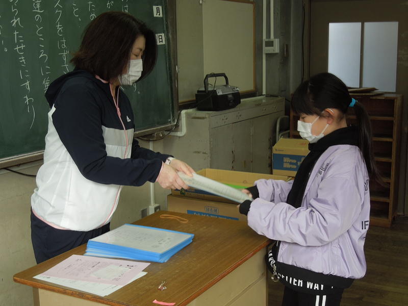 26日(木)、今日は1~5年生まで登校日でした。各学級で修了証書、通知表を担任から受け取った子供たち、興味深々に見入る姿が印象的でした。最後の20分間は、離任する先生方からのお別れの挨拶を放送で聞きました。職員室では、転出される8名の先生方に5年生の代表児童がPTAで準備くださった花束を感謝の気持ちをもって渡しました。短い時間でしたが、久しぶりに学校に響く子供たちの声を聞き、大変うれしく思いました。