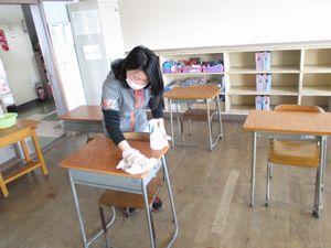 2020年4月3日 15時31分新型コロナウイルスで休校が続いておりましたが,6日(月)の始業式・入学式から学校の再開に向けて準備を行いました。感染防止対策として塩素系漂白剤を使って,各教室の机・イスや入学式会場,廊下や階段の手すり等の消毒を行いました。学校でもできうる限りの対策を講じてまいります。ご家庭でもマスク(手作りなど含)の準備や不要不急の外出を避ける等,子どもたちの健康を守るご協力をお願いいたします。