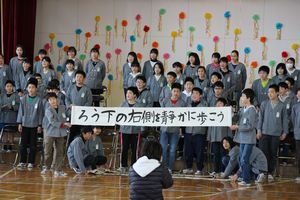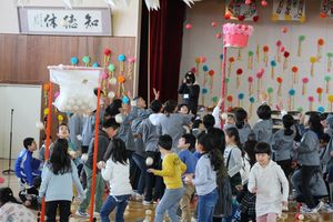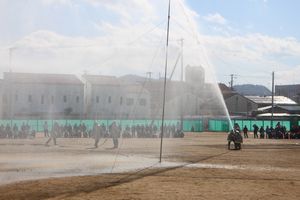 本日13:00から校庭で瀬上地区の初午行事である消防出初式が実施されました。式の中で6年生の代表児童が市内で2つしか残っていない手押しポンプによる放水を行い、全校生がその様子を見学しました。4人が1組となって手押しポンプで送水し、2人1組になって的に向かって放水し、昔の消防の仕組みを学びました。その後、消防団の方による放水訓練の様子を見学しましたが、四方から放水される水の勢いに圧倒されているようでした。消防団に入る人が少なくなってきたとのこと、大人になってひとりでも多く消防団に入って地域の安全を守ってほしいものです。