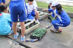 2018年10月18日 13時46分本日昼休み、栽培委員会の児童がプランターに苗植えをしました。”花と緑の農芸財団”主催の「花の輪運動」に応募し、本年度もパンジーやビオラ、ノースポールなどの苗300株をいただきました。花のプランターは全部で44できました。校門や昇降口にたくさん飾ることができます。来年の春、きれいに咲かせられるようにしっかりと世話していきます。