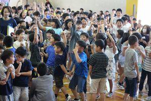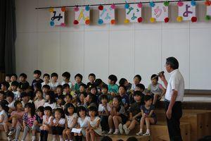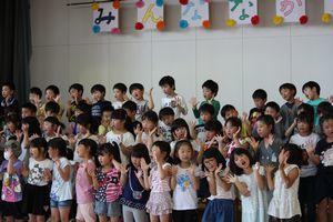 2019年5月25日 12時00分本日3校時、児童会代表委員会が企画した1年生を迎える会”なかよし集会”を実施しました。6年生のお兄さんお姉さんに手を取られて一緒に、あたたかい拍手に迎えられて入場しました。校長先生のお話や代表児童の歓迎の言葉を聞いた後、〇×クイズやじゃんけんジェンカで全校生とふれ合ったり、”ドラえもん”を歌ったりして楽しいひと時を過ごしました。最後に1年生がお礼の言葉を大きな声で発表することができました。元気いっぱい、笑顔いっぱいの”なかよし集会”でした。