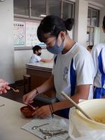 2020年9月3日 14時13分本日,地元の内池平蔵商店社長の内池栄治さんにご来校いただき,6年2組と6年3組の児童が味噌の天地返しを行いました。5年生の1月に仕込んだ味噌です。5月に内池さんと本校栄養教諭の上原子先生で1回目の天地返しを行いました。今回が2回目の天地返しで内池さんから説明を聞いた後、児童自身が体験しました。最後に,少しだけ味見をさせてもらいました。10月には,この味噌を使って調理実習をする予定です。