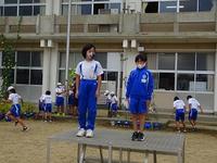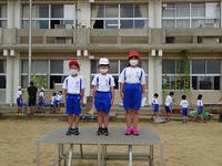 昼休みに運動会の開会式,閉会式等の練習を校庭で行いました。開会式の開式の言葉の2年生,閉式の言葉の3年生,ラジオ体操の指揮をする運動委員会委員長,閉会式の開会の言葉の4年生,校歌の指揮をする6年生,閉会の言葉の5年生の代表児童が,返事から式台への上がり方と降り方の一連の練習をしました。