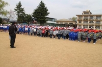 2017年4月26日 12時33分 本日3校時に地震発生を想定した避難訓練を実施しました。緊急時の避難経路を確認することを主な目的として実施しました。避難開始の指示から校庭に避難完了して人員確認するまでかかった時間は2分55秒でした。地震発生時の安全確保として”倒れてくる物がないか”、”落ちてくる物がないか”、”動いてくる物がないか”の3つに気をつけることを指導しました。家にいて地震が発生した時もどの場所に避難して余震に備えるか確認しておいてください。
