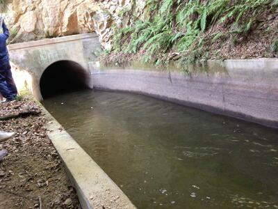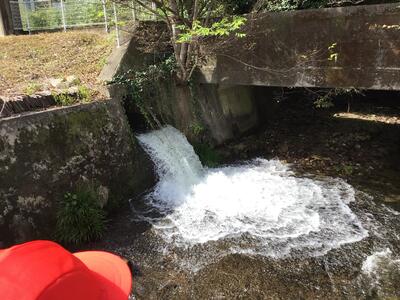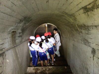 次に、江戸時代に西根堰ができた頃に作られた取水口を見学しました。狭い所を通って、森の中の取水口を興味津々で見ていました。