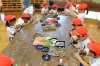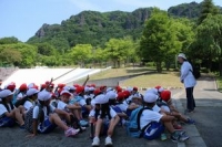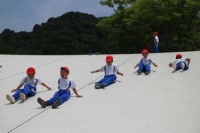 2017年6月20日 14時26分 本日、第2学年が霊山子どもの村で自然ふれあい活動を実施しました。天候にも恵まれ、さわやかな夏空の下、壮大な霊山の岩山を眺めながら活動することができました。活動の前半、1、2組が木工クラフト作りに、3、4組がアスレチック遊びや巨大シャボン玉づくりに,後半は交代して取り組みました。子どもたちが夢中になって遊んでいたのが滑り台遊びでした。長くスピードも速く、飽きることなく何度も滑っていました。お昼においしいお弁当を食べて帰ってきました。思い出に残る1日になったことでしょう。