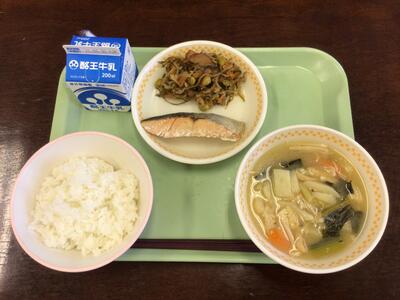 9月22日(水)の給食は、「秋彼岸献立」で、ごはん、小松菜のみそ汁、鮭の塩焼き、切り昆布の炒め煮、牛乳でした。