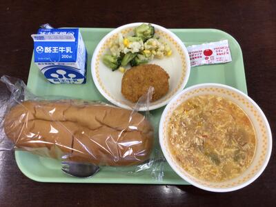 9月24日(金)の給食は、「三春町の献立」で、減量黒パン、トマトとたまごのスープ、ピーマン入りメンチカツ、花野菜サラダ、パックケチャップ、牛乳でした。