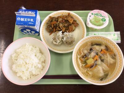 9月27日(月)の給食は、ごはん、みそワンタンスープ、きのこしゅうまい、ホイコーロー、洋梨ゼリー、牛乳でした。